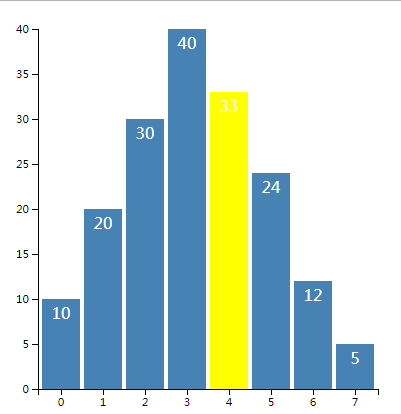 var rects = svg .selectAll('.MyRect') .data(dataset) .enter() .append('rect') .attr('class', 'MyRect') .attr( 'transform', 'translate(' + padding.left + ',' + padding.top + ')' ) .attr('x', function(d, i) { return xScale(i) + rectPadding / 2 }) .attr('y', function(d) { return yScale(d) }) .attr('width', xScale.rangeBand() - rectPadding) .attr('height', function(d) { return height - padding.top - padding.bottom - yScale(d) }) .attr('fill', 'steelblue') .on('mouseover', function(d, i) { d3.select(this).attr('fill', 'yellow') }) .on('mouseout', function(d, i) { d3.select(this) .transition() .duration(500) .attr('fill', 'steelblue') })