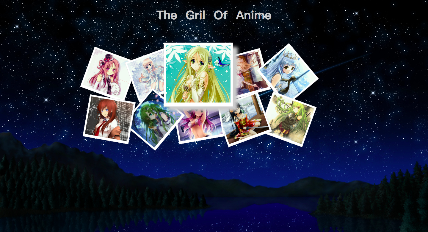 | body { background: #eee; background-image: url("image/main.jpg"); } h1 { text-align: center; color: #ccc; font-family: 华文行楷; word-spacing: 15px; font-size: 40px; } #container { width: 960px; height: 450px; margin: 50px auto; position: relative; } #container img { padding: 5px 5px 8px; background: #fff; border: 1px solid #ddd; position: absolute; width: 144px; height: 128px; -webkit-transition: 0.5s; -moz-transition: 0.5s; transition: 0.5s; } #container img:hover { -webkit-transform: rotate(0deg); -moz-transform: rotate(0deg); transform: rotate(0deg); -webkit-transform: scale(1.5); -moz-transform: scale(1.5); transform: scale(1.5); box-shadow: 10px 10px 10px #ccc; z-index: 2; } .pic1 { top: 50px; left: 50px; -webkit-transform: rotate(20deg); -moz-transform: rotate(20deg); transform: rotate(20deg); } .pic2 { top: 50px; left: 200px; -webkit-transform: rotate(-20deg); -moz-transform: rotate(-20deg); transform: rotate(-20deg); } .pic3 { top: 50px; left: 350px; -webkit-transform: rotate(10deg); -moz-transform: rotate(10deg); transform: rotate(10deg); } .pic4 { top: 50px; left: 500px; -webkit-transform: rotate(-15deg); -moz-transform: rotate(-15deg); transform: rotate(-15deg); } .pic5 { top: 50px; left: 650px; -webkit-transform: rotate(50deg); -moz-transform: rotate(50deg); transform: rotate(50deg); } .pic6 { top: 200px; left: 650px; -webkit-transform: rotate(20deg); -moz-transform: rotate(20deg); transform: rotate(20deg); } .pic7 { top: 200px; left: 500px; -webkit-transform: rotate(-20deg); -moz-transform: rotate(-20deg); transform: rotate(-20deg); } .pic8 { top: 200px; left: 350px; -webkit-transform: rotate(-10deg); -moz-transform: rotate(-10deg); transform: rotate(-10deg); } .pic9 { top: 200px; left: 200px; -webkit-transform: rotate(-50deg); -moz-transform: rotate(-50deg); transform: rotate(-50deg); } .pic10 { top: 200px; left: 50px; -webkit-transform: rotate(10deg); -moz-transform: rotate(10deg); transform: rotate(10deg); }