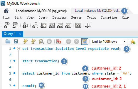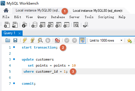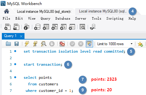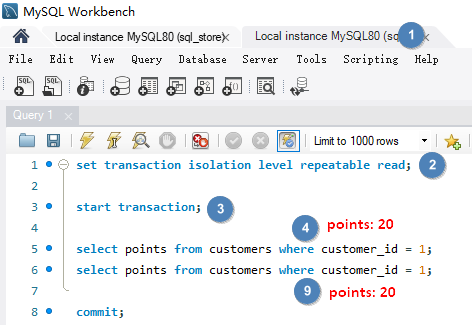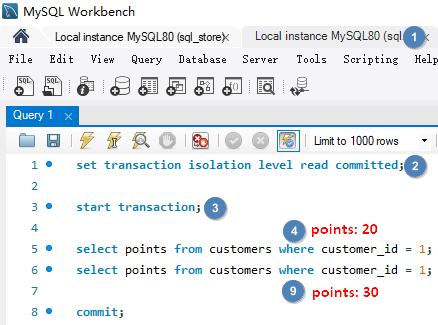 将第一个操作 commit 之后,第二个也进行 commit, 如下客户 customer_id 为 1 的积分会增加 20。