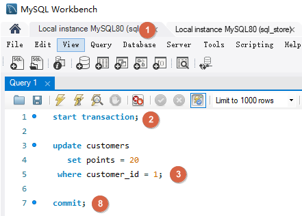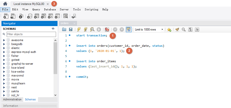 1 2 3 4 5 6 7 8 9 start transaction; insert into orders(customer_id, order_date, status)values (1 , '2020-01-01' , 1 ); insert into order_itemsvalues (last_insert_id(), 1 , 1 , 1 ); commit ;