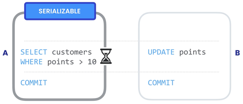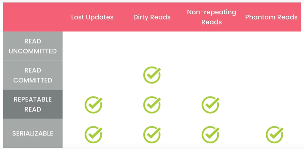 幻读是指在事务执行查询之后进行了添加,更新或删除,实际读取的是添加,更新或删除之前的数据,事务执行完成之后仍然有符合条件的数据,这种突然出现的数据就像幽灵 👻 一样。解决此问题需要为事务建立隔离级别 SERIALIZABLE, 它能保证当有别的事务在更新数据时,我们的事务能够知晓变动,如果有其它事务修改了可能影响查询结果的数据,我们的事务必须等待它们完成。这是事务的最高隔离级别,保证最大的确定性,但是会影响性能。