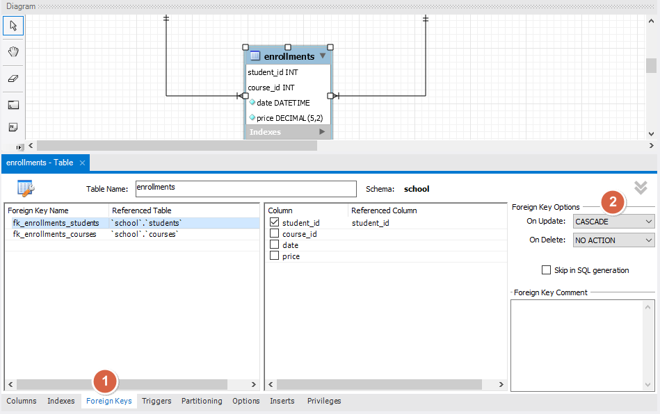 Setting Foreign Key,CASCADE on update, NO ACTION(RESTRICT) on delete (reject delete)