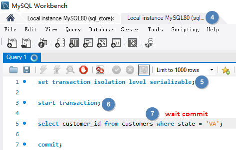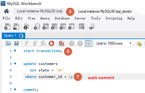 如下在第一个连接中将客户的积分加 10 但是没有提交。在第二个连接中同样执行将客户的积分加 10 的操作,此时会等待第一个连接操作的 commit 或 rollback.