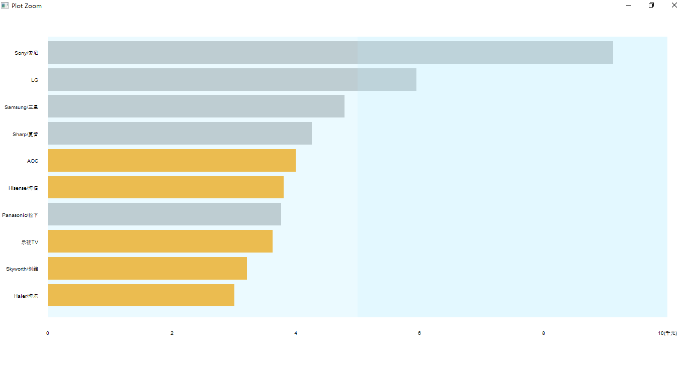 price_brands <- price_brands[order(price_brands$current_price),] x <- barplot(price_brands$current_price, names.arg = price_brands$brand, horiz = T, las=1, cex.names = 0.6, border = NA, col = "grey", axes = F, xlim = c(0, 10000)) china_price_vector <- price_brands$current_price * price_brands$china china_price_vector barplot(china_price_vector, names.arg = F, horiz = T, las=1, border = NA, col = "orange1", axes = F, add = T) axis(side = 1, at = c(0, 2000, 4000, 6000, 8000, 10000), labels = c(0, 2, 4, 6, 8, '10(千元)'), tick = F, cex.axis = 0.6)