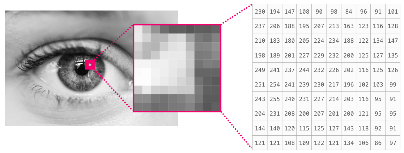 If the image is black and white (a.k.a. grayscale), each pixel can be represented by a single number (commonly between 0 (black) and 255 (white)). Want to crop the top left 10 x 10 pixel part of the image? Just tell NumPy to get you