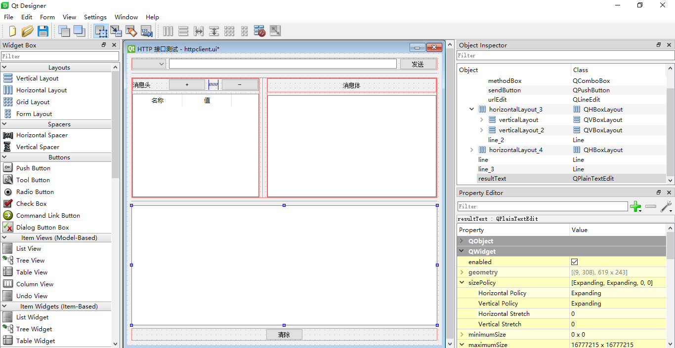 运行 C:\Program Files\Python36\Scripts\pyside2-designer.exe 创建 User Interface: httpclient.ui