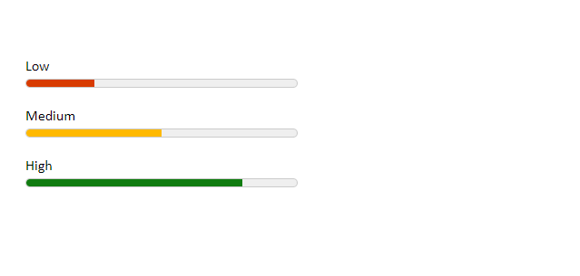 1 2 3 4 5 6 7 8 9 10 11 12 13 14 15 16 17 18 19 20 21 22 23 24 25 26 27 28 29 30 31 32 <label for ="value1" > Low</label > <meter id="value1" min="0" max="100" low="30" high="75" optimum="80" value="25" ></meter > <label for ="value2" > Medium</label > <meter id="value2" min="0" max="100" low="30" high="75" optimum="80" value="50" ></meter > <label for ="value3" > High</label > <meter id="value3" min="0" max="100" low="30" high="75" optimum="80" value="80" ></meter >