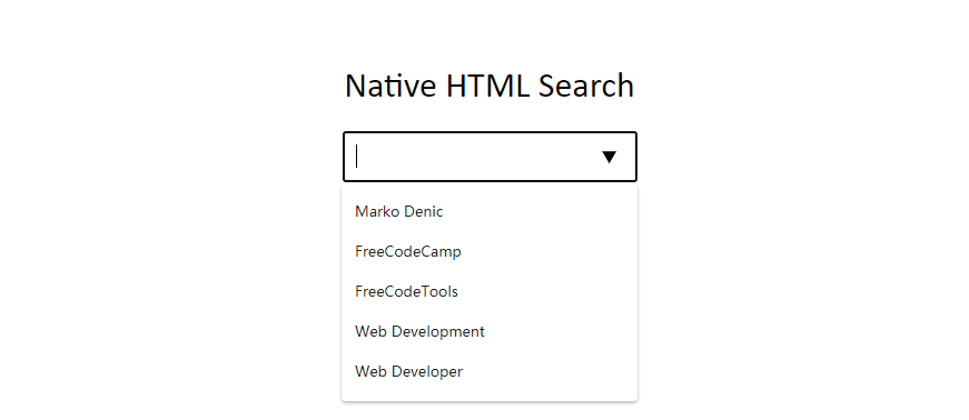 1 2 3 4 5 6 7 8 9 10 11 12 13 <div class ="wrapper" > <h1 > Native HTML Search</h1 > <input list ="items" /> <datalist id ="items" > <option value ="Marko Denic" > </option > <option value ="FreeCodeCamp" > </option > <option value ="FreeCodeTools" > </option > <option value ="Web Development" > </option > <option value ="Web Developer" > </option > </datalist > </div >