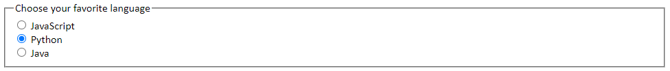 1 2 3 4 5 6 7 8 9 10 11 12 13 14 <form > <fieldset > <legend > Choose your favorite language</legend > <input type ="radio" id ="javascript" name ="language" /> <label for ="javascript" > JavaScript</label > <br /> <input type ="radio" id ="python" name ="language" /> <label for ="python" > Python</label > <br /> <input type ="radio" id ="java" name ="language" /> <label for ="java" > Java</label > </fieldset > </form >