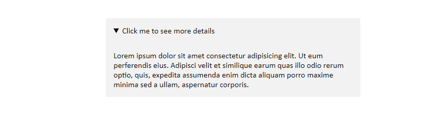 1 2 3 4 5 6 7 8 9 10 11 12 13 14 15 16 17 18 19 20 21 22 .wrapper { padding : 30px ; display : flex; justify-content : center; } details { width : 100% ; max-width : 500px ; } summary { background : #f2f2f2 ; cursor : pointer; padding : 15px ; } p { padding : 15px ; margin : 0 ; background : #f2f2f2 ; }