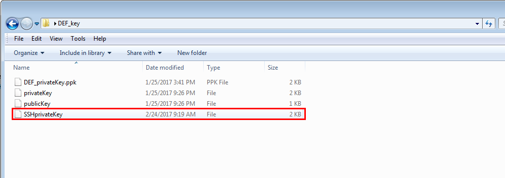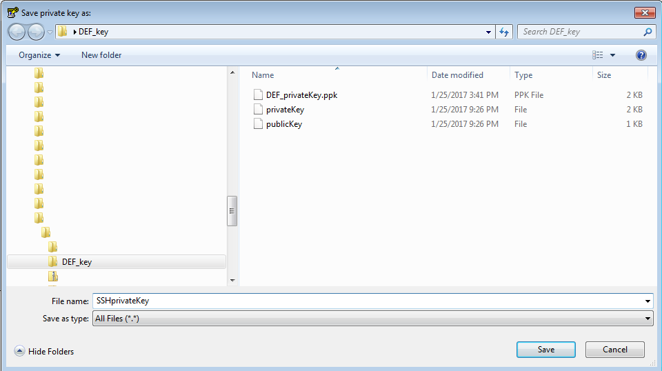 Name the privateKey.ppk file and save as type .ppk (PuTTY Private Key Files), by entering the .ppk extension. This ensures that you aren’t overwriting the original private key.