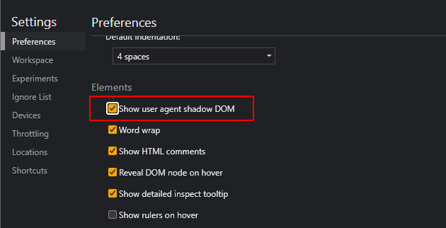 在未开启显示 Shadow Dom 和 User Agent Styles 的情况下,没有办法看到元素的 Shadow DOM 和其 User Agent Styles 样式,当需要覆盖元素的代理样式时需要在浏览器设定中开启相关设置。