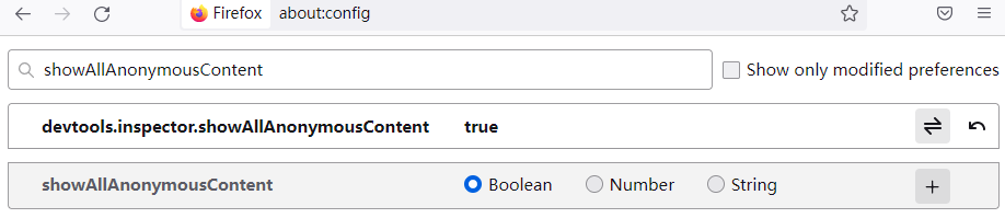 在地址栏输入 about:config 开启 devtools.inspector.showAllAnonymousContent。