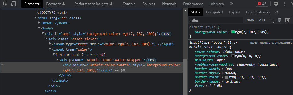 | <template> <div id="app" :style="{ backgroundColor: color }"> <div class="color-picker"> <input type="text" :style="{ color: color }" v-model="color"/> <input type="color" v-model="color"/> </div> </div> </template>