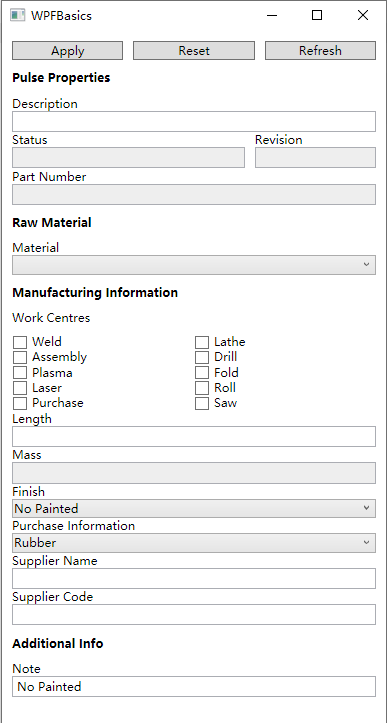 1 2 3 4 5 6 7 8 9 10 11 12 13 14 15 16 17 18 19 20 21 22 23 24 25 26 27 28 29 30 31 32 33 34 35 36 37 38 39 40 41 42 43 44 45 46 47 48 49 50 51 52 53 54 55 56 57 58 59 60 61 62 63 64 65 66 67 68 69 70 71 72 73 74 75 76 77 78 79 80 81 82 83 84 85 86 87 88 89 90 91 92 93 94 95 96 97 98 99 100 101 102 103 104 105 106 <Window x:Class ="WPFBasics.MainWindow" xmlns ="http://schemas.microsoft.com/winfx/2006/xaml/presentation" xmlns:x ="http://schemas.microsoft.com/winfx/2006/xaml" xmlns:d ="http://schemas.microsoft.com/expression/blend/2008" xmlns:mc ="http://schemas.openxmlformats.org/markup-compatibility/2006" xmlns:local ="clr-namespace:WPFBasics" mc:Ignorable ="d" Title ="WPFBasics" Left ="300" Top ="0" Height ="800" Width ="400" Loaded ="Window_Loaded" > <Border Padding ="10" > <StackPanel > <Grid > <Grid.ColumnDefinitions > <ColumnDefinition Width ="*" /> <ColumnDefinition Width ="*" /> <ColumnDefinition Width ="*" /> </Grid.ColumnDefinitions > <Button x:Name ="ApplyButton" Click ="ApplyButton_Click" Margin ="0 0 10 0" Grid.Column ="0" Content ="Apply" /> <Button x:Name ="ResetButton" Click ="ResetButton_Click" Grid.Column ="1" Content ="Reset" /> <Button Margin ="10 0 0 0" Grid.Column ="2" Content ="Refresh" /> </Grid > <TextBlock Text ="Pulse Properties" FontWeight ="Bold" Margin ="0 10" /> <TextBlock Text ="Description" /> <TextBox x:Name ="DescriptionText" Padding ="2" /> <Grid > <Grid.ColumnDefinitions > <ColumnDefinition Width ="2*" /> <ColumnDefinition Width ="*" /> </Grid.ColumnDefinitions > <StackPanel Grid.Column ="0" Margin ="0 0 10 0" > <TextBlock Text ="Status" /> <TextBox IsReadOnly ="True" Background ="#eee" Padding ="2" /> </StackPanel > <StackPanel Grid.Column ="1" > <TextBlock Text ="Revision" /> <TextBox IsReadOnly ="True" Background ="#eee" Padding ="2" /> </StackPanel > </Grid > <TextBlock Text ="Part Number" /> <TextBox IsReadOnly ="True" Background ="#eee" Padding ="2" /> <TextBlock Text ="Raw Material" FontWeight ="Bold" Margin ="0 10" /> <TextBlock Text ="Material" /> <ComboBox Padding ="2" /> <TextBlock Text ="Manufacturing Information" FontWeight ="Bold" Margin ="0 10" /> <TextBlock Text ="Work Centres" Margin ="0 0 0 10" /> <Grid > <Grid.ColumnDefinitions > <ColumnDefinition Width ="*" /> <ColumnDefinition Width ="*" /> </Grid.ColumnDefinitions > <StackPanel Grid.Column ="0" Margin ="0 0 10 0" > <CheckBox Checked ="CheckBox_Checked" x:Name ="WeldCheckBox" Content ="Weld" /> <CheckBox Checked ="CheckBox_Checked" x:Name ="AssemblyCheckBox" Content ="Assembly" /> <CheckBox Checked ="CheckBox_Checked" x:Name ="PlasmaCheckBox" Content ="Plasma" /> <CheckBox Checked ="CheckBox_Checked" x:Name ="LaserCheckBox" Content ="Laser" /> <CheckBox Checked ="CheckBox_Checked" x:Name ="PurchaseCheckBox" Content ="Purchase" /> </StackPanel > <StackPanel Grid.Column ="1" > <CheckBox Checked ="CheckBox_Checked" x:Name ="LatheCheckBox" Content ="Lathe" /> <CheckBox Checked ="CheckBox_Checked" x:Name ="DrillCheckBox" Content ="Drill" /> <CheckBox Checked ="CheckBox_Checked" x:Name ="FoldCheckBox" Content ="Fold" /> <CheckBox Checked ="CheckBox_Checked" x:Name ="RollCheckBox" Content ="Roll" /> <CheckBox Checked ="CheckBox_Checked" x:Name ="SawCheckBox" Content ="Saw" /> </StackPanel > </Grid > <TextBlock Text ="Length" /> <TextBox x:Name ="LengthText" Padding ="2" /> <TextBlock Text ="Mass" /> <TextBox x:Name ="MassText" IsReadOnly ="True" Background ="#eee" Padding ="2" /> <TextBlock Text ="Finish" /> <ComboBox x:Name ="FinishDropdown" SelectionChanged ="FinishDropdown_SelectionChanged" SelectedIndex ="1" Padding ="2" > <ComboBoxItem > Painted</ComboBoxItem > <ComboBoxItem > No Painted</ComboBoxItem > </ComboBox > <TextBlock Text ="Purchase Information" /> <ComboBox SelectedIndex ="0" Padding ="2" > <ComboBoxItem > Rubber</ComboBoxItem > <ComboBoxItem > No Rubber</ComboBoxItem > </ComboBox > <TextBlock Text ="Supplier Name" /> <TextBox x:Name ="SupplierText" TextChanged ="SupplierText_Changed" Padding ="2" /> <TextBlock Text ="Supplier Code" /> <TextBox Padding ="2" /> <TextBlock Text ="Additional Info" FontWeight ="Bold" Margin ="0 10" /> <TextBlock Text ="Note" /> <TextBox x:Name ="NoteText" Padding ="2" /> </StackPanel > </Border > </Window >