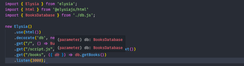 Now, moving back to our index.ts we create a route to serve this index.html . Elysia provides a static plugin as well which we won’t use since we have only 2 static files.