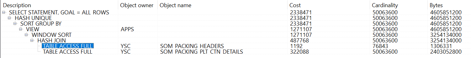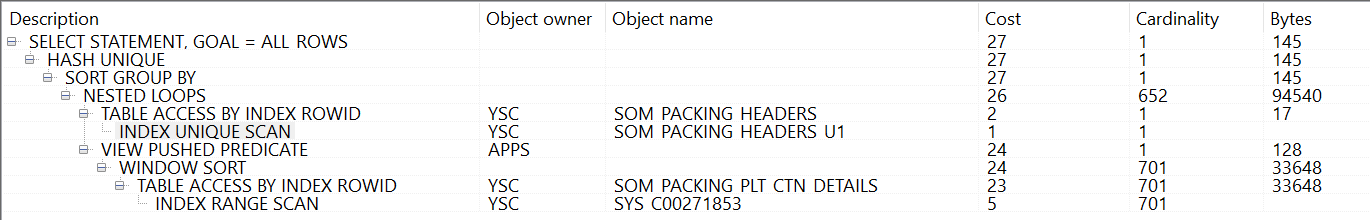 | select distinct "ITEMS_IN_CARTON", "WT_NET_PER_CARTON" as net_weight, "WT_GROSS_PER_CARTON" as gross_weight, "CTN_DIM_L" as length, "CTN_DIM_W" as width, "CTN_DIM_H" as height, "INVOICE_NO" from (select listagg(t.item_no || '|' || t.qty_per_carton_item, ',') within group(order by t.item_no) as items_in_carton, sum(t.wt_net_per_carton) as wt_net_per_carton, sum(t.wt_net_per_carton) + t.unit_wt_ctn_item as wt_gross_per_carton, t.ctn_dim_l, t.ctn_dim_w, t.ctn_dim_h, t.invoice_no from (select scd.fg_qty as qty_per_carton_item, scd.unit_wt_fg_item * scd.fg_qty as wt_net_per_carton, scd.unit_wt_ctn_item, scd.ctn_dim_l, scd.ctn_dim_w, scd.ctn_dim_h, scd.item_no, scd.pallet_seq, not_null_pallet_ctn_seq as pallet_ctn_seq, seh.invoice_no, seh.invoice_pack_type from som_packing_headers seh, (select s.*, nvl(s.pallet_ctn_seq, row_number() over (partition by s.packing_header_id order by s.pallet_ctn_seq)) as not_null_pallet_ctn_seq from som_packing_plt_ctn_details s) scd where seh.packing_header_id = scd.packing_header_id) t group by t.pallet_seq, t.pallet_ctn_seq, t.ctn_dim_l, t.ctn_dim_w, t.ctn_dim_h, t.unit_wt_ctn_item, t.invoice_no) where invoice_no = p_invoice_no;