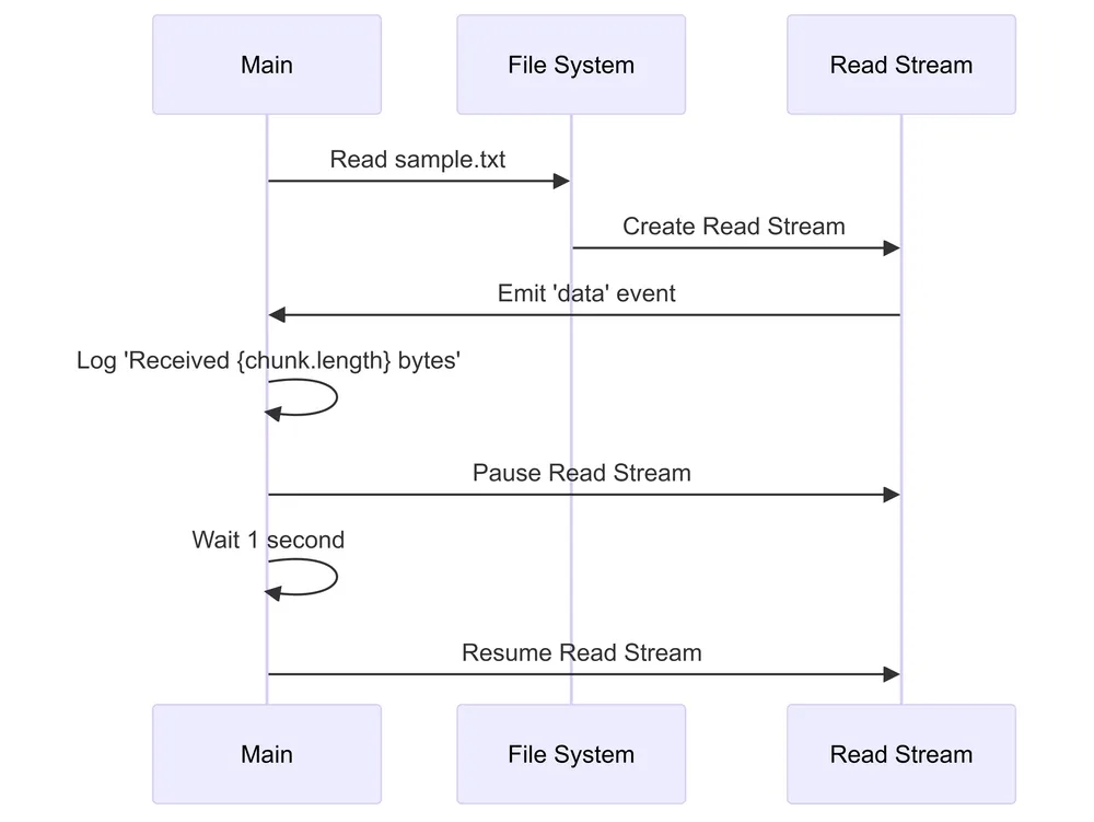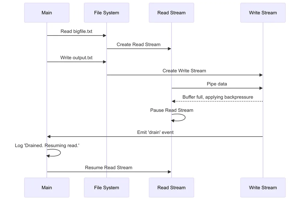 writeStream's buffer fills up, it emits ‘drain’ event. - When ‘drain’ occurs, resume reading to manage backpressure.