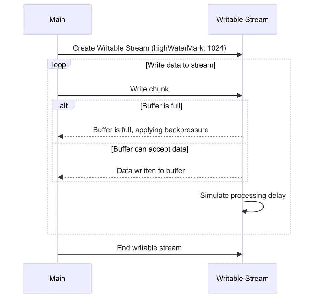 Let’s continue with our analogy of the queue of people wanting to enter the room. When the room reaches its capacity (buffer is full), the manager stops allowing more people to enter. This is akin to the writable stream applying backpressure because it cannot handle more data at the moment.