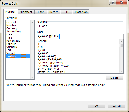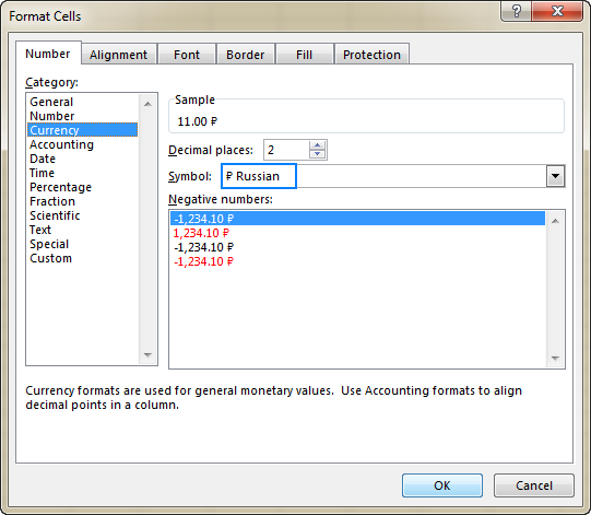 - Open the Format Cells dialog, select Currency under Category, and choose the desired currency from the Symbol drop-down list, e.g. Russian Ruble: