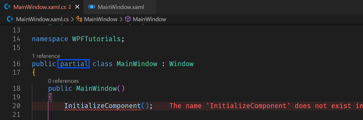Open the WPFTutorials using VSCode. There is a problem The name ‘InitializeComponent’ does not exist in the current context in MainWindow.xaml.cs. Becuase the MainWindow is a partial class, the InitializeComponent is automatically generated during the build process from the MainWindow.xaml. This method is crucial for initializing the UI components defined in your XAML.