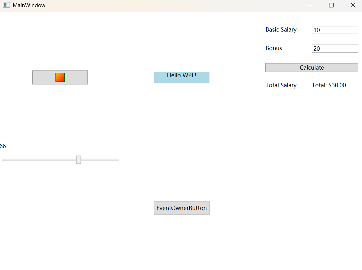 MainWindow.xaml 1 2 3 4 5 6 7 8 9 10 11 12 13 14 15 16 17 18 19 20 21 22 23 24 25 26 27 28 29 30 31 32 33 34 35 36 37 38 39 40 41 42 43 44 45 46 47 48 49 50 51 52 53 54 55 56 57 58 59 60 61 62 63 64 65 66 67 68 69 70 71 <Window x:Class ="WPFTutorials.MainWindow" xmlns ="http://schemas.microsoft.com/winfx/2006/xaml/presentation" xmlns:x ="http://schemas.microsoft.com/winfx/2006/xaml" xmlns:d ="http://schemas.microsoft.com/expression/blend/2008" xmlns:mc ="http://schemas.openxmlformats.org/markup-compatibility/2006" xmlns:sys ="clr-namespace:System;assembly=mscorlib" xmlns:control ="clr-namespace:ControlLibrary;assembly=ControlLibrary" xmlns:local ="clr-namespace:WPFTutorials" mc:Ignorable ="d" Title ="MainWindow" Height ="600" Width ="800" > <Window.Resources > <local:Human x:Key ="human" Name ="Babb" Child ="babb chen" /> <sys:String x:Key ="stringHello" > Hello WPF!</sys:String > </Window.Resources > <Grid > <Grid.RowDefinitions > <RowDefinition Height ="*" /> <RowDefinition Height ="*" /> </Grid.RowDefinitions > <Grid.ColumnDefinitions > <ColumnDefinition Width ="*" /> <ColumnDefinition Width ="*" /> <ColumnDefinition Width ="*" /> </Grid.ColumnDefinitions > <Button Grid.Row ="0" Grid.Column ="0" Width ="120" Height ="30" Click ="Button_Click" > <Button.Content > <Rectangle Width ="20" Height ="20" Stroke ="DarkGreen" > <Rectangle.Fill > <LinearGradientBrush StartPoint ="0,0" EndPoint ="1,1" > <GradientStop Offset ="0.2" Color ="Orange" /> <GradientStop Offset ="0.7" Color ="OrangeRed" /> <GradientStop Offset ="1" Color ="Red" /> </LinearGradientBrush > </Rectangle.Fill > </Rectangle > </Button.Content > </Button > <TextBlock Grid.Row ="0" Grid.Column ="1" Height ="24" Width ="120" TextAlignment ="Center" Background ="LightBlue" Text ="{StaticResource ResourceKey=stringHello}" /> <Grid Grid.Row ="1" Grid.Column ="0" > <Grid.RowDefinitions > <RowDefinition Height ="24" /> <RowDefinition Height ="4" /> <RowDefinition Height ="24" /> </Grid.RowDefinitions > <TextBlock x:Name ="textBlock" Text ="{Binding ElementName=slider, Path=Value}" /> <Slider x:Name ="slider" Grid.Row ="2" Minimum ="0" Maximum ="100" Value ="50" /> </Grid > <Button x:Name ="eventOwnerButton" Content ="EventOwnerButton" Grid.Row ="1" Grid.Column ="1" Width ="120" Height ="30" /> <control:SalaryCaculator Grid.Row ="0" Grid.Column ="2" Grid.ColumnSpan ="2" /> </Grid > </Window >